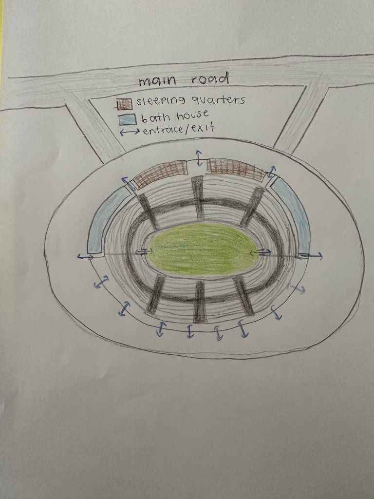 Amphitheaters, during these roman times, are used for events such as gladiator combats, chariot races, animal slaying and even executions which draw huge crowds. This proposed Fruor Velit Amphitheatrum will not only host these events but will have additional features to accommodate visitors and make them feel welcomed and at home. Specifically, this amphitheater will be able to hold 25,000 spectators and there will be guest quarters and a bath house weaved into the design so those who have traveled from another city (spectators and those participating in events) can take care of themselves. “Fruor” means enjoyment because everyone will have fun when they are at the Fruor outdoor amphitheater. Picture a strong male gladiator entering the city of Dēstinātiō in a horse drawn carriage to participate in a battle. He is happy to have guest quarters to prepare for and rest before his great battle, which calms his nerves and mentally prepares him for his fight. After his battle he is excited that he doesn’t have to leave town to head back home in a very long carriage ride. Instead, he can clean up in the bath house, change his clothes and spend time with all of the new people he has met. He can contribute to the economy but eating and drinking and shopping while he stays in town, and everything is within a short walking distance.